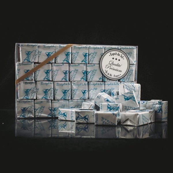 Nous avons fait élaborer un caramel très légèrement salé à la Fleur de Sel. Ce caramel contient du Pineau, du beurre et du lait entier qui sont tous des produits de la région Poitou-Charentes. C’est un caramel doré et moelleux qui lorsqu’il fond en bouche vous ensoleille le palais. Il fait le « Régal de la Saunière ».