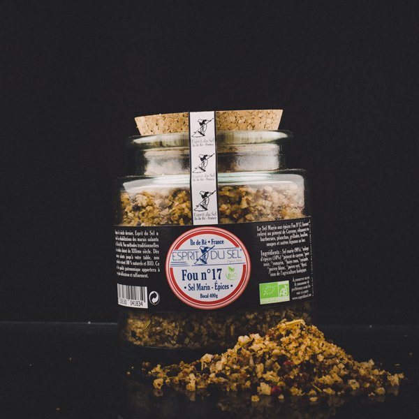 Sel Marin 90%, Mélange d’épices 10% (*Piment de Cayenne, *Poivre noir, *Romarin, *Coriandre, *Baies roses, *Poivre blanc, *Poivre vert, *Thym)